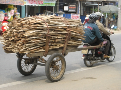 Vợ chồng anh Lợi đi chở củi bỏ mối, mỗi ngày kiếm được từ 700 ngàn đồng đến 1 triệu đồng, đây là khoản thu nhập không hề nhỏ! (Hình: Phi Khanh/Người Việt)