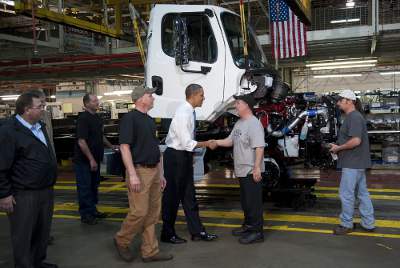 Tổng Thống Barack Obama gặp gỡ công nhân xưởng Daimler Trucks North America ở Mount Holly, North Carolina, nơi ông trình bày về nền kinh tế và mức tiêu thụ xăng dầu trong nước. Thăm dò cho thấy giá xăng lên đang làm giảm mức ủng hộ đối với Tổng Thống Obama. (Hình: Saul Loeb/AFP/Getty Images)