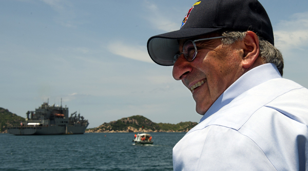 Ông Leon Panetta khi còn là bộ trưởng Quốc Phòng Mỹ đến cảng Cam Ranh năm 2012. (Hình: Jim Watson-Pool/Getty Images)