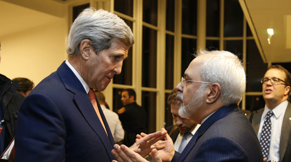 Ngoại Trưởng Mỹ John Kerry (trái) nói chuyện với đồng nhiệm Iran, ông Mohammad Javad Zarif, sau khi IAEA xác nhận Iran đã thi hành đúng thỏa ước. (Hình: AP/Kevin Lamarque)