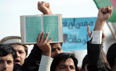 Dân Hồi Giáo ở Islamabad, Pakistan, cầm kinh Koran hô khẩu hiệu bài Mỹ, sau vụ đốt kinh tại một căn cứ của NATO ở Afghanistan và bạo động xảy ra trong nhiều ngày. (Hình: Aamir Qureshi/AFP/Getty Images)