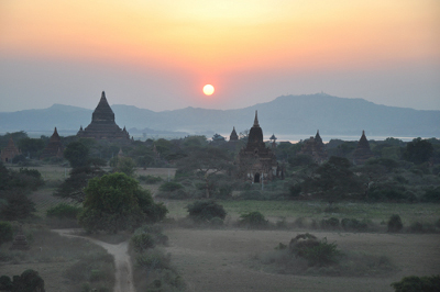 Buổi sáng sớm Tháng Hai, thành phố lịch sử Bagan có hơi nóng của một xứ sở nhiệt đới. Từ cửa sổ máy bay nhìn xuống, trùng trùng điệp điệp những chùa và tháp được xây từ thế kỷ thứ 11. Số liệu của Sở Du Lịch Miến Ðiện cho biết, hơn 5,000 chùa và tháp từ thuở xa xưa của vùng này, nay chỉ còn khoảng hơn 2,000.