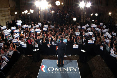 Ông Mitt Romney vẫy chào người ủng hộ tại The Grain Exchange ở Milwaukee, Wisconsin, sau khi thắng trong cả ba cuộc bầu cử sơ bộ ngày Thứ Ba. (Hình: Justin Sullivan/Getty Images)