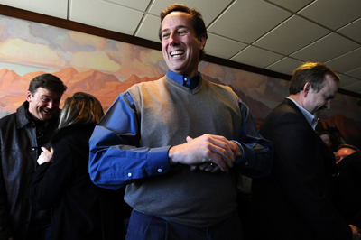 Cựu Thượng Nghị Sĩ Rich Santorum (Pennsylvania), ứng cử viên tổng thống đảng Cộng Hòa, tươi cười tại cuộc họp báo ở một nhà hàng tại Boone, Iowa. Cho tới 5 giờ chiều Thứ Hai, thăm dò cho thấy ông dẫn đầu Iowa Caucus. (Hình: Jewel Samad/AFP/Getty Images)