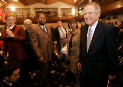 Mục Sư Pat Robertson tiến lên khán đài trong một buổi nói chuyện tại câu lạc bộ Báo Chí Quốc Gia ở Washington D.C. năm 2005. Trên đài Christian Broadcasting Network và trên báo New York Times, ông lên tiếng ủng hộ hợp pháp hóa cần sa. (Hình: Win McNamee/Getty Images)