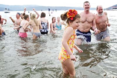 Không chỉ ở Idaho, mà ở nhiều nơi khác như New York, Wisconsin, …, đúng ngày Tết Dương Lịch người ta tổ chức nhảy xuống biển, xuống hồ, bất kể thời tiết lạnh lẽo. Có nơi tổ chức hội này như một dịp gây quỹ cho từ thiện. (Hình: AP Photo/Coeur d’Alene Press, Jerome A. Pollos)