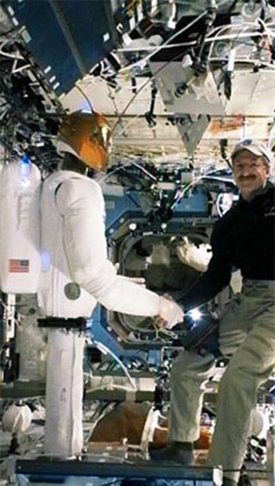 Ðây là lần đầu tiên có cái bắt tay lịch sử giữa người máy với người thật và được diễn ra trên không gian.