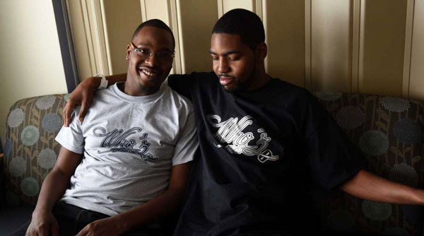 Stan Larkin (phải) ngồi bên cạnh anh ruột Dominique, cả hai cùng bị chứng bệnh cơ tim bẩm sinh và đều được thay tim. (Hình: AP/Melanie Maxwell)