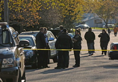 Cảnh sát tập trung tại địa điểm nơi 3 người bị bắn chết ở một nhà trẻ thuộc Brooklyn Park, Minneapolis, vào sáng sớm Thứ Hai, 9 Tháng Tư, 2012. (Hình: AP/Star Tribune/Richard Sennott)