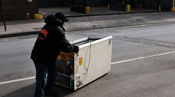 | Một công nhân ở New York City đẩy một tủ đá ra bãi phế thải. (Hình: Getty Images/Spencer Platt) |