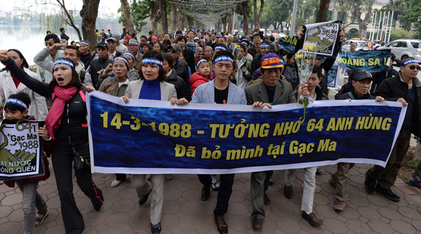 Cư dân Hà Nội biểu tình diễn hành tưởng niệm những người lính đã thiệt mạng khi bị hải quân Trung Quốc tấn công ở bãi Gạc Ma hồi năm 1988.