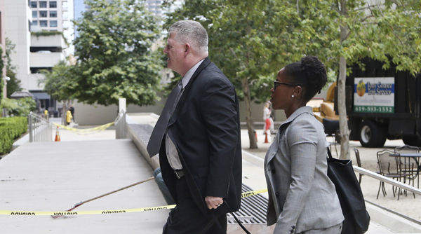 Phó Đô Đốc Robert Gilbeau (trái) bước vào tòa án ở San Diego. (Hình: AP Photo/Lenny Ignelzi)