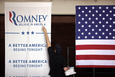 MANCHESTER, NH – Ðến 7 giờ tối (giờ California) ngày 24 Tháng Tư, mọi dự đoán đều cho rằng ứng cử viên Mitt Romney thắng tất cả 5 bầu cử “primary” tại 5 tiểu bang: New York, Connecticut, Delaware, Rhode Island và Pennsylvania. Trong hình, một thiện nguyện viên treo bảng chuẩn bị cho sự xuất hiện của Mitt Romney. (Hình: Chip Somodevilla/Getty Images)