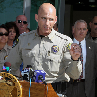 FLORENCE, Arizona (AP) – Paul Babeu, sheriff quận hạt Pinal tiểu bang Arizona công nhận ông là người đồng tính trong một cuộc họp báo hôm Thứ Bảy tại Florence. Sheriff Babeu thuộc đảng Cộng Hòa và hiện đang tranh cử vào Hạ Viện Hoa Kỳ, bị một tình nhân cũ người gốc Mỹ La Tinh tố cáo là đã dọa sẽ trục xuất ông này nếu ông tiết lộ mối tình hai người. Ông Babeu có lập trường cứng rắn chống di dân không giấy tờ. (Hình: AP Photo/The Arizona Republic, Deirdre Hamill)