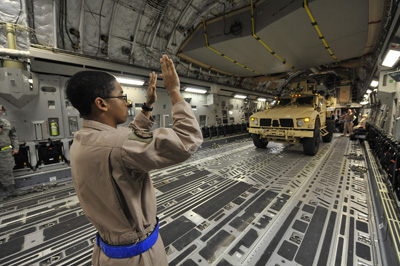 Một binh sĩ hướng dẫn đưa xe quân sự lên máy bay tại Căn Cứ Hỗn Hợp Lewis-McChord để chở sang chiến trường Afghanistan. (Hình: US Air Force)