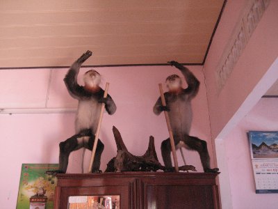 Cặp vọc nhồi bông mà thầy Năm được tặng dùng trang trí trong nhà, ông Năm nói: “Ðây là loại hàng quốc cấm, cỡ thầy mới dám chưng!” (Hình: Phi Hùng/Người Việt)