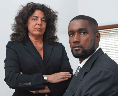 Albert Florence (phải) ngồi bên cạnh luật sư riêng, vừa thua kiện vụ khiếu nại bị cởi đồ để khám xét đến hai lần vì tội không đóng tiền phạt, mặc dù tiền phạt đã được trả. (Hình: AP/Mel Evans)
