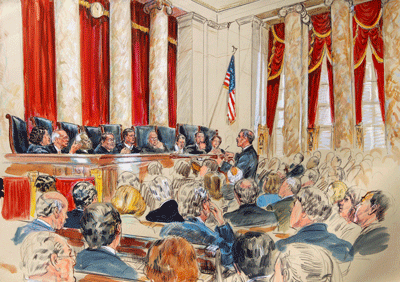 27 Tháng Ba, ngày thứ nhì trong ba ngày Ðạo Luật Cải Tổ Y Tế do Tổng Thống Obama ký ban hành năm 2010, được mang ra điều trần trước Tối Cao Pháp Viện. Mục đích điều trần nhằm xác định liệu điều khoản cưỡng bách cá nhân phải mua bảo hiểm y tế có vi hiến hay không. Trong hình, vẽ lại quang cảnh tại Tối Cao Pháp Viện: Luật Sư Ðại Diện Chính Phủ Hoa Kỳ, Donald B. Verrilli, Jr. phát biểu trước các thẩm phán (Hàng ngồi, từ trái, là các thẩm phán Sonia Sotomayor, Stephen Breyer, Clarence Thomas, Antonin Scalia, Chủ Tịch Tối Cao Pháp Viện John Roberts, Anthony Kennedy, Ruth Bader Ginsburg Samuel Alito và Elana Kagan). (Hình: AP Photo/Dana Verkouteren)