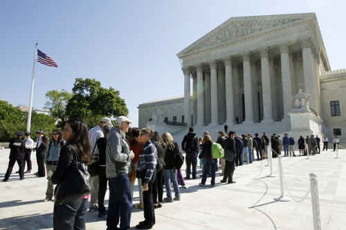 Dân chúng tụ tập trước trụ sở Tối Cao Pháp Viện liên bang ở thủ đô Washington hôm Thứ Tư 25 tháng 4 trong khi các thẩm phán nghe diều trần về điều khoản “cho tôi xem giấy tờ” trong đạo luật di dân của tiểu bang Arizona. (Hình: AP /Charles Dharapak)