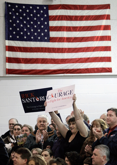 Với kết quả các cuộc thăm dò cử tri cho thấy hai bên đang kè nhau rất sát, ông Santorum tìm cách nêu bật lên gốc gác gia đình lao động của mình, trong khi ông Romney cố gắng đánh tan sự lo ngại của cử tri bảo thủ về thành tích của ông khi còn là thống đốc tiểu bang Massachusetts. Người ủng hộ ứng cử viên Rick Santorum đón mừng ông tại Kalamazoo, Michigan, hôm Thứ Hai. Ứng cử viên này đang tới sát nút Mitt Romney tại Michigan, nơi ông Romney sinh ra, lớn lên, và cha ông từng làm thống đốc. (Hình: AP Photo/Eric Gay)