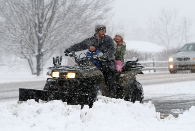 Một ông bố chở hai người con đi cào tuyết trước sân nhà ở quận hạt Augusta County, Virginia. Một trận bão mùa Ðông đổ tuyết dày nhiều inch xuống miền Nam nước Mỹ, trước khi thổi ra biển. (Hình: AP Photo/Norm Shafer)