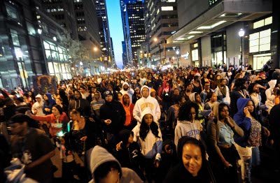 Cuộc biểu tình “Một triệu áo trùm đầu tuần hành” diễn ra hôm Thứ Sáu tại nhiều thành phố nước Mỹ để ủng hộ gia đình Trayvon Martin. Trong hình là cuộc biểu tình tại Philadelphia, với khoảng từ 5,000 tới 8,000 người tham gia. (Hình: AP Photo/The Inquirer, Ron Tarver)