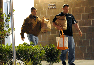 George Zimmerman, trái, bước ra khỏi nhà giam John E. Polk Correctional Facility ở Sanford, Fl., đêm Chủ Nhật. (Hình: AP Photo/Brian Blanco)