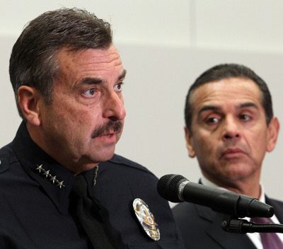 Cảnh sát trưởng thành phố Los Angeles, Charlie Beck (trái) trong cuộc họp báo. Ðứng cạnh là Thị Trưởng Antonio Villaraigosa. (Hình: AP/Nick Út)
