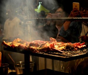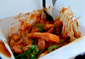 Bắt gặp được một nhóm thực khách người Việt, được họ cho biết, họ thích món mực nướng Nam Hàn và thịt nướng kiểu Thái (satay). Kế bên là gian hàng bán shawarma (thịt nướng kiểu Ả Rập) rất ngon và lạ miệng.