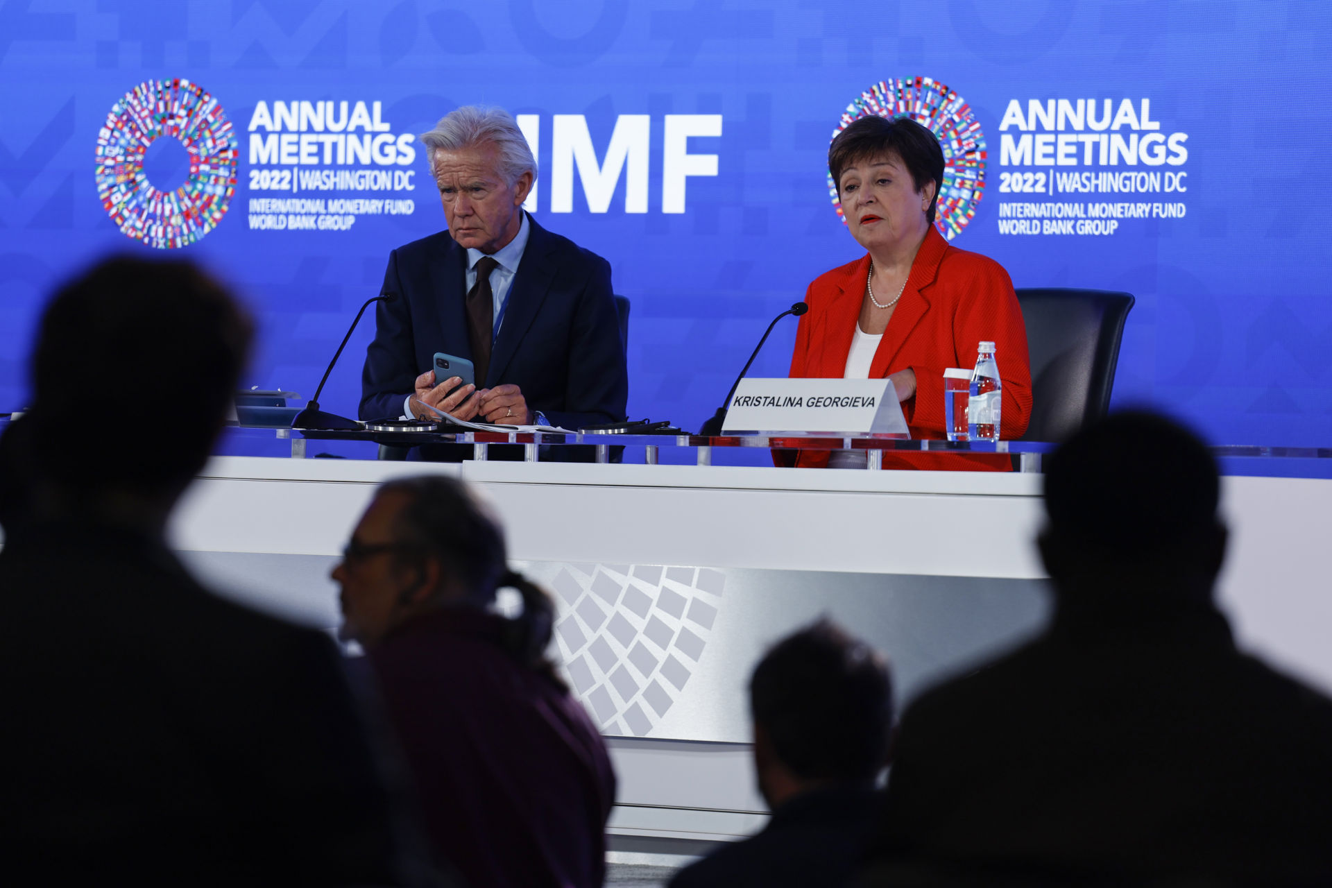 Bà Kristalina Georgieva (phải), giám đốc điều hành Quỹ Tiền Tệ Quốc Tế (IMF), phát biểu trong cuộc họp thường niên của IMF và Ngân Hàng Thế Giới (World Bank). (Hình: Anna Moneymaker/Getty Images)