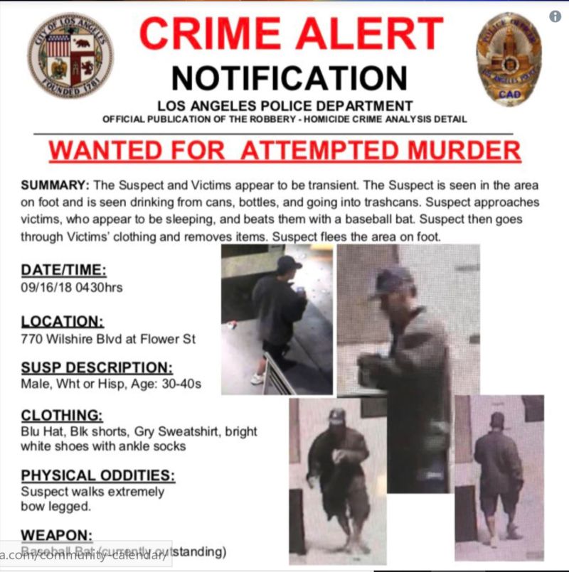 Bản tin của đài truyền hình địa phương KTLA 5 nói rằng những người này trong tình trạng trầm trọng sau khi bị một người đàn ông dùng gậy liên tiếp đập vào đầu và vai, lúc trước rạng đông hôm Chủ Nhật.