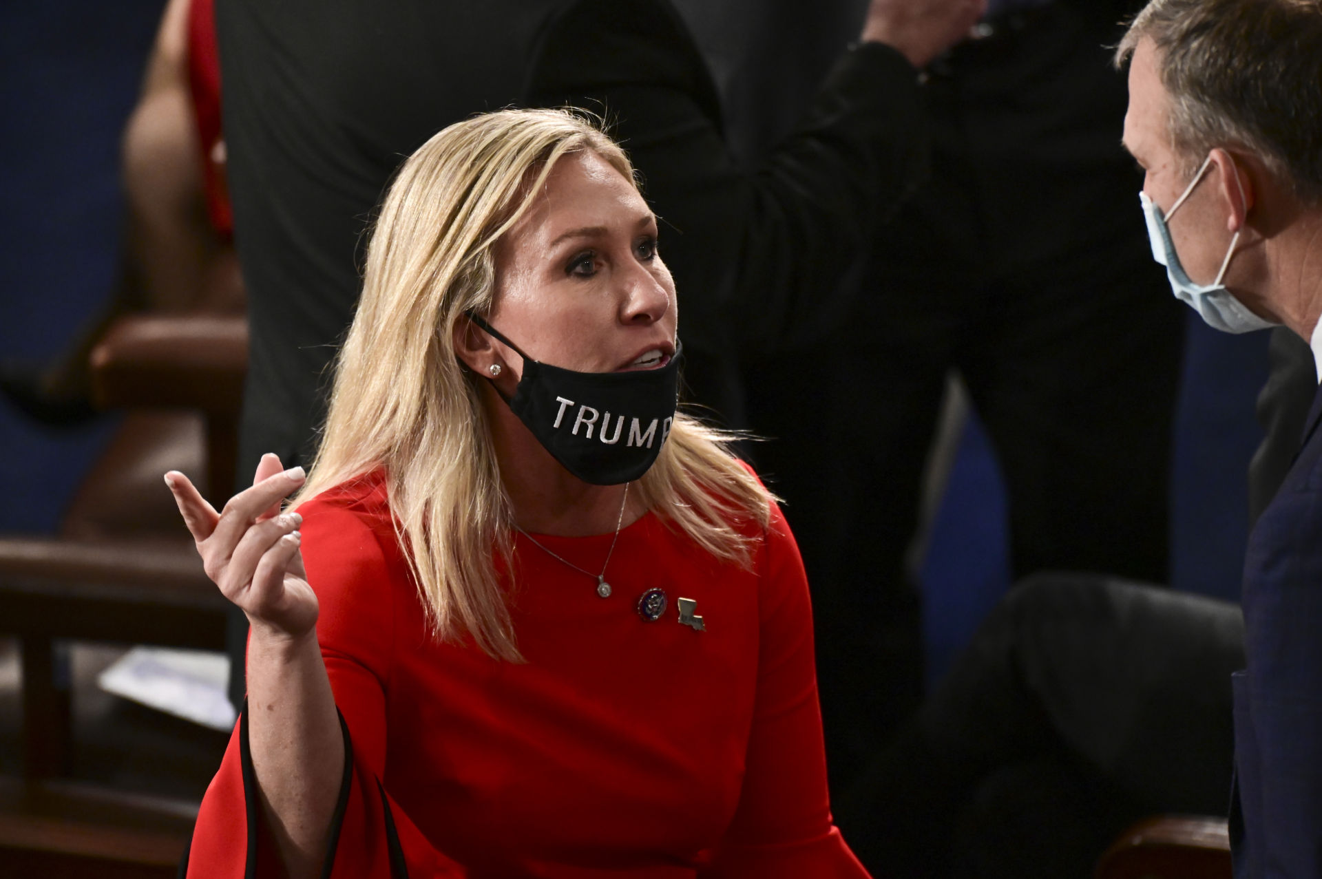Dân Biểu Marjorie Taylor Greene (Cộng Hòa-Georgia) người cổ xúy những thuyết âm mưu “dối trá, bệnh hoạn,” theo lời lên án của Thượng Nghị Sĩ Mitch McConnell (Cộng Hòa-Kentucky), trưởng Khối Thiểu Số Thượng Viện. (Hình: Erin Scott-Pool/Getty Images)