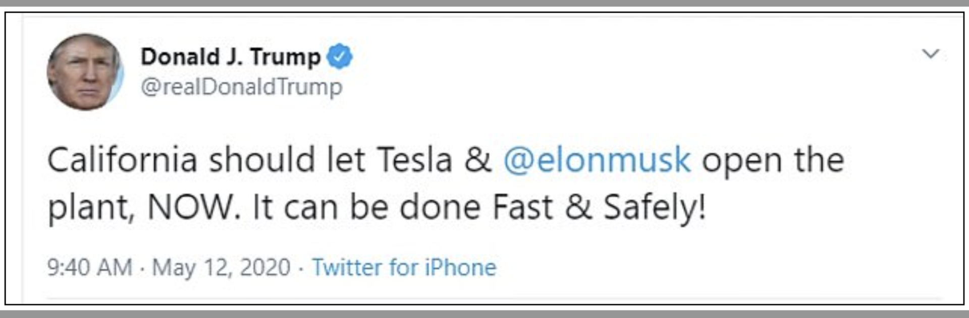 Sau khi đại dịch COVID-19 bùng phát tại Mỹ, tiểu bang California ban hành lệnh ở yên tại nhà vào Tháng Ba, 2020, buộc nhà máy Tesla ở Fremont phải tạm ngừng sản xuất, ông Musk giận dữ chỉ trích chính sách này “cầm tù mọi người trong nhà của họ.”