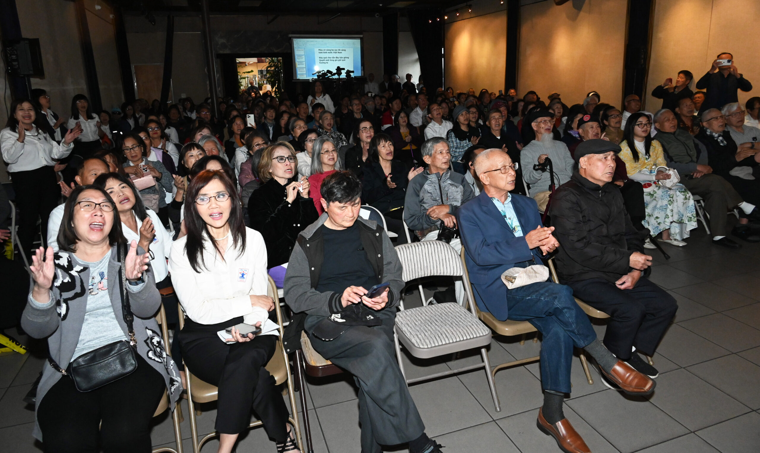 Cả hội trường đầy kín người tham dự, ngồi tràn cả lối đi và ra ngoài.