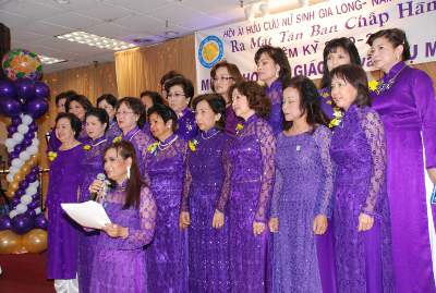 Cựu nữ sinh trường Áo Tím Gia Long trong một buổi ra mắt tân ban chấp hành. (Hình: Nguyên Huy/Người Việt)