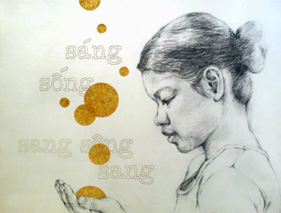 Đặc biệt tựa đề các tác phẩm của cô thể hiện sự hiểu biết về tiếng Việt của người họa sĩ trẻ, như “Sáng Sóng Sang Sông Sang”, “Mất, Mò Mắt, Mờ, Mắt Mở”, hay “Biển, Biến, Biên”