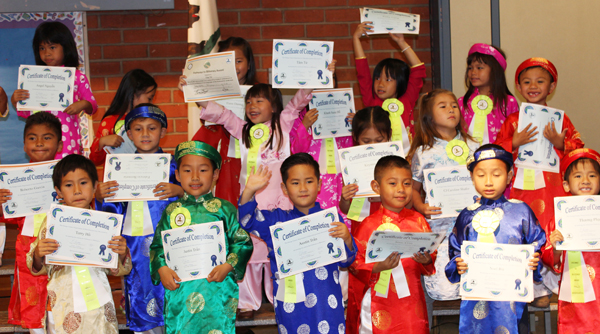 Gần 40 học sinh được chia làm hai toán lên lãnh chứng chỉ mãn khóa của Sở Giáo Dục Orange County và bằng Hoàn Tất Mẫu Giáo Song Ngữ (Pathway to Biliteracy Awards).
