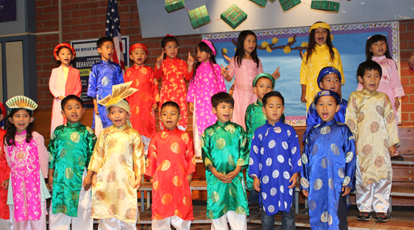 Học sinh lớp mẫu giáo Việt-Anh trình diễn bài hát tiếng Việt. (Hình: Học Khu Westminster)