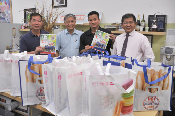 Từ trái, nhà báo Khôi Nguyên, nhà báo Linh Nguyễn, ông Giang Vũ (đại diện Lee’s Sandwiches), và nhà báo Ðỗ Dzũng, bên các phần thưởng cho giải Copa America. (Hình: Dân Huỳnh/Người Việt)