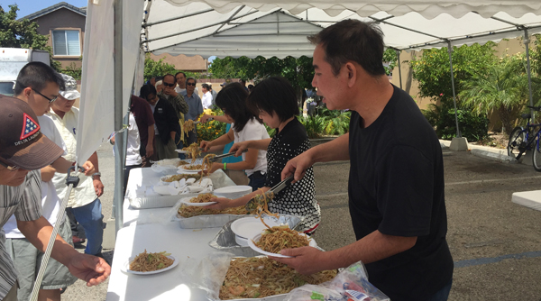 Nhà báo Khôi Nguyên phục vụ đồng hương món mì xào do nhà hàng Mon Cheri bảo trợ. (Hình: Đỗ Dzũng/Người Việt)