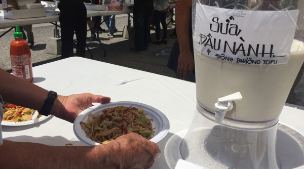 Vừa ăn mì xào vừa uống sữa đậu nành do Đông Phương Tofu tài trợ. (Hình: Đỗ Dzũng/Người Việt)