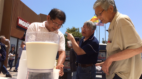 Nhà báo Đỗ Dzũng (trái) phục vụ dân ghiền xem bóng đá món sữa đậu nành của Đông Phương Tofu. (Hình: Khôi Nguyên/Người Việt)