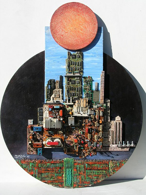 Thời gian đó ông vẽ nhiều thể loại khác nhau, nhưng chính yếu vẫn là vẽ tranh hỗn hợp, thể hiện cách nhìn mới của ông trước đời sống công nghiệp hiện đại với điện tử và computer. “Từ những con chip điện tử của các máy điện toán, tôi kết hợp các kỹ thuật gò, ép kim khí… để tạo nên những tác phẩm pha trộn giữa họa và điêu khắc, hay chạm trổ. Từ đây ra loạt tranh Con Người Với Computer (Mankind & Computers),” ông nói.