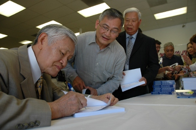 Nhà báo Sơn Ðiền Nguyễn Viết Khánh (trái) ký tuyển tập “Những Mùa Xuân Trở Lại” trong buổi ra mắt tại phòng sinh hoạt nhật báo Người Việt năm 2008. (Hình: Ðỗ Dzũng/Người Việt)