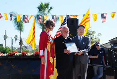 Ông nói: “Họ đã cùng sát cánh bên nhau trải qua một cuộc chiến để bảo vệ tự do cho Việt Nam trước sự xâm lăng của đế quốc Cộng Sản qua tay Cộng Sản Việt Nam. Hôm nay họ gặp nhau đây sau 40 năm cuộc chiến chấm dứt để nối nhịp cầu với nhau. Thành phố Westminster xin được xác nhận sự hy sinh cao cả của những người cựu chiến binh Hoa Kỳ và VNCH đã hết lòng chiến đấu cho tự do. Và cũng xin nhân danh thế hệ trẻ để bày tỏ lòng tri ơn của chúng tôi với quí vị.”