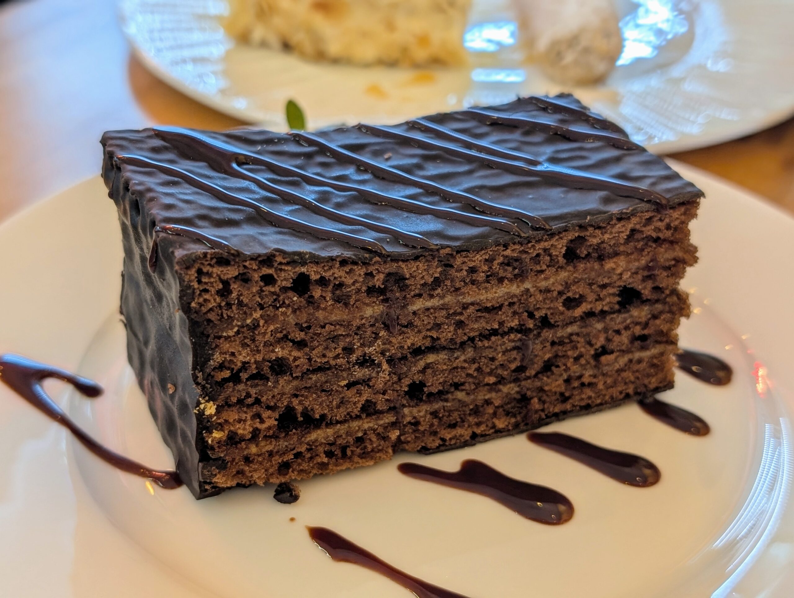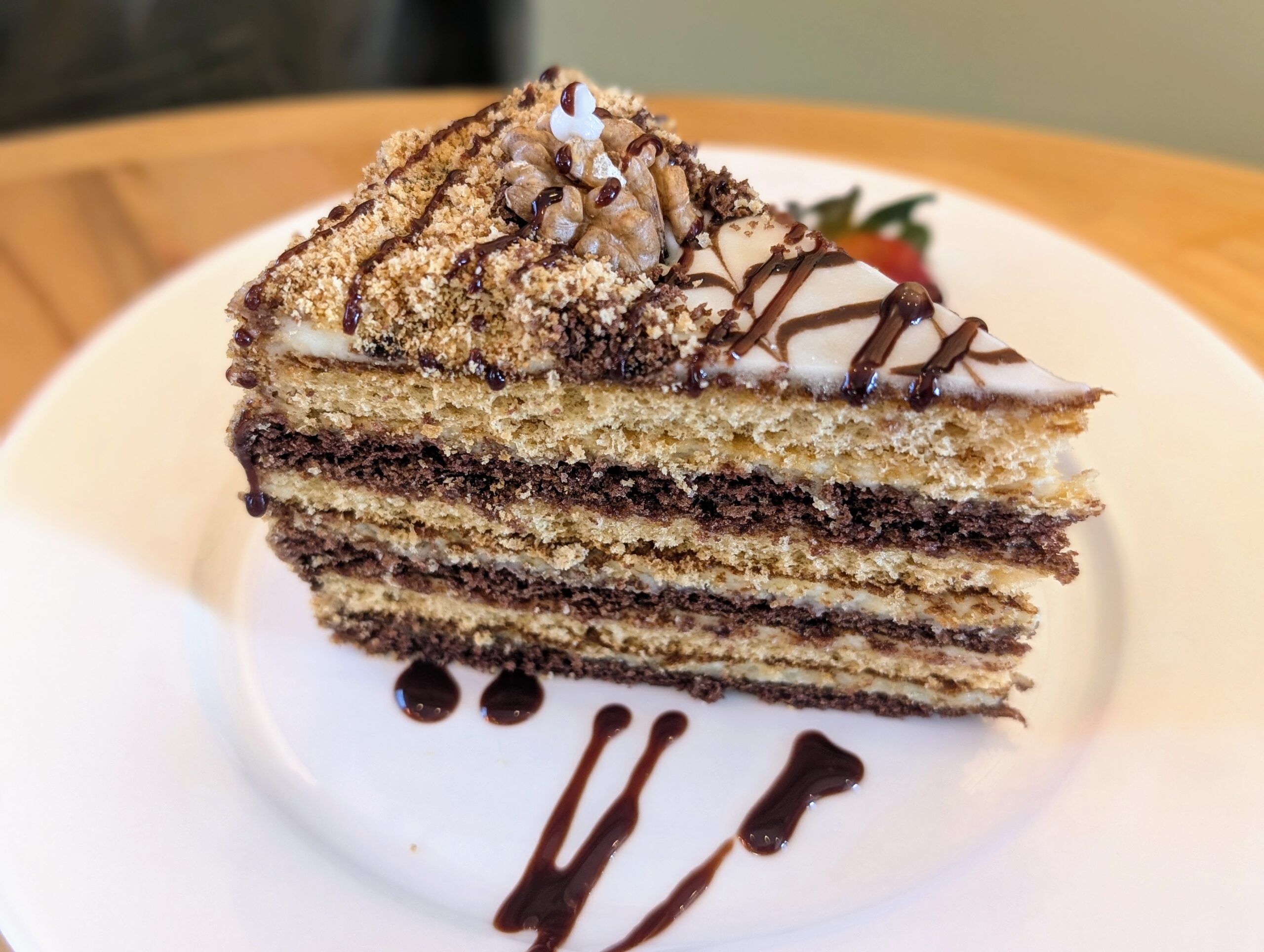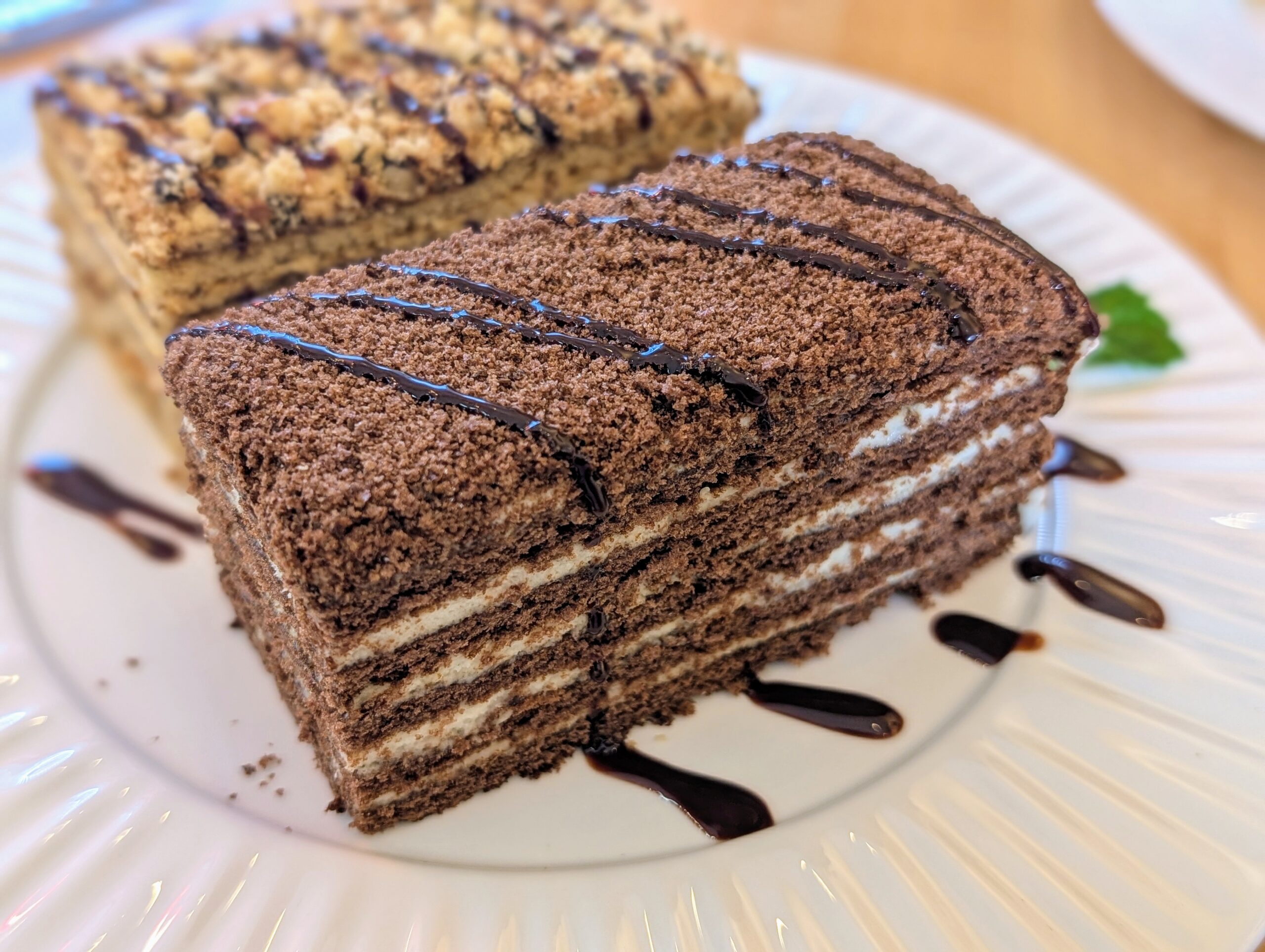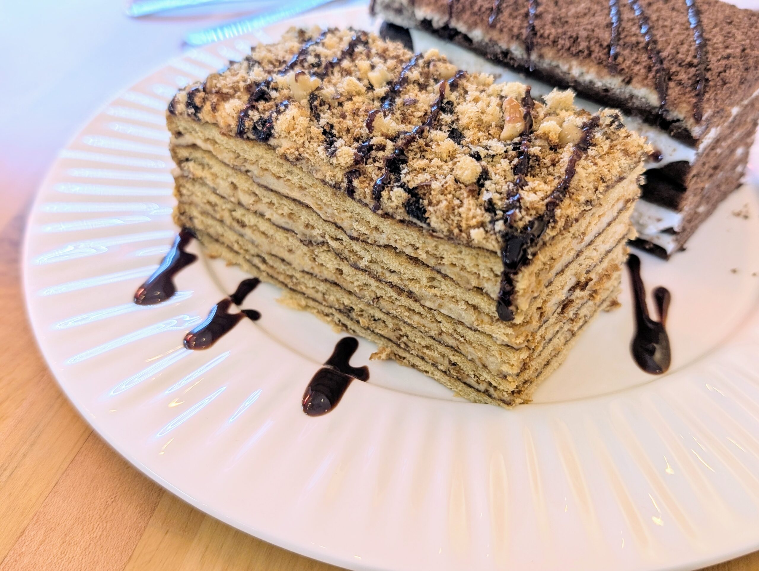 Sau khi ăn bánh mặn, tôi thử các loại bánh mật ong nổi tiếng của thương hiệu Marlenka, đầu tiên là loại bánh mật ong thường. Loại bánh này có những miếng bánh bông lan mùi mật ong, có thêm những lớp kem caramel ở giữa, và ở trên là những miếng vụn bánh giòn mùi mật ong với hạt hồ đào rang và một chút nước xốt chocolate.