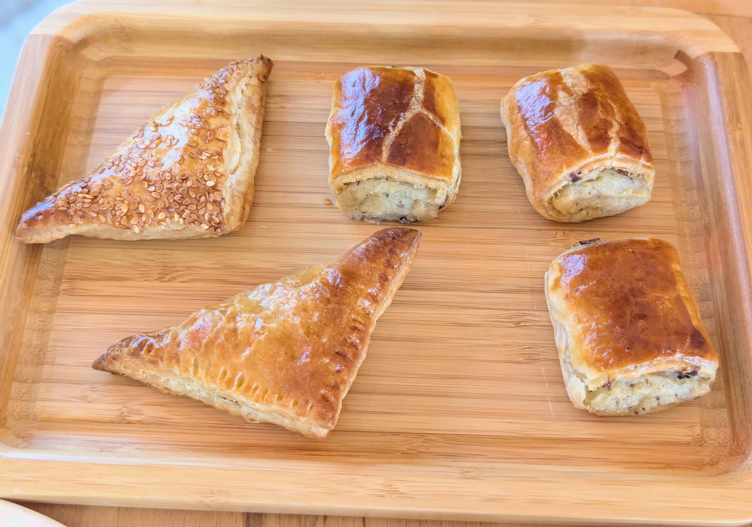 Vì bánh đã được làm sẵn nên tôi không phải chờ lâu, và thử các loại bánh mặn trước. Các loại bánh mặn đó gồm có bánh nhân khoai tây với nấm, bánh nhân phô mai và bánh nhân phô mai với rau spinach.