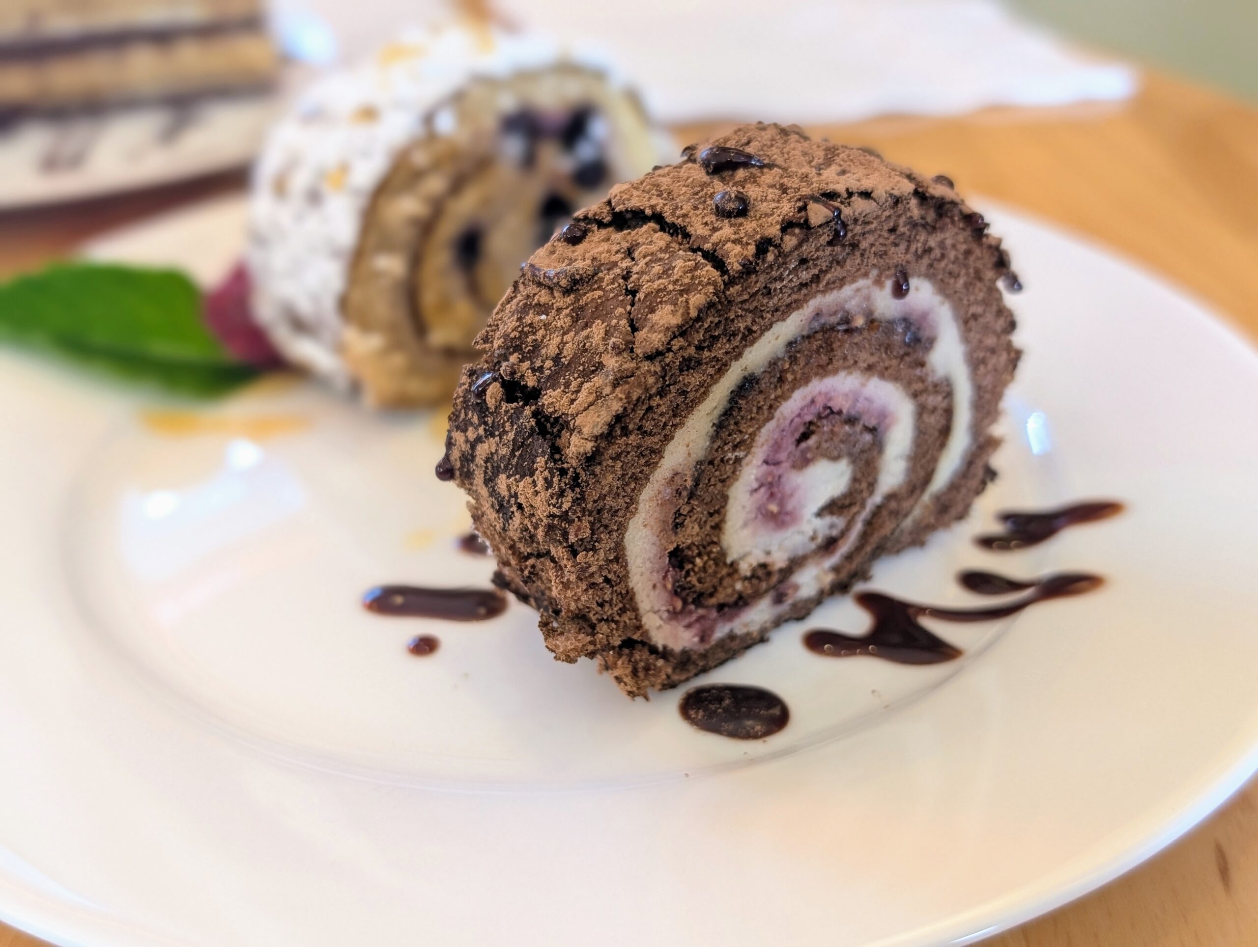 Thấy trong tủ còn có hai loại bánh bông lan mật ong cuốn nên tôi gọi thử, và có hai mùi là blueberry với raspberry. Loại bánh nhân raspberry có lớp bánh chocolate cuốn có nhiều trái raspberry được sấy lạnh ở giữa. Bánh mềm xốp có vị ngọt và đắng vừa phải, có vị béo của kem cùng vị chua tự nhiên của những trái raspberry sấy rất dễ ăn. Bánh bông lan cuốn mùi blueberry thì có lớp bánh mật ong bình thường, có kem với nhiều trái blueberry sấy lạnh ở giữa, đầy vị ngọt của mật ong kết hợp với vị chua của blueberry cũng ngon không kém.