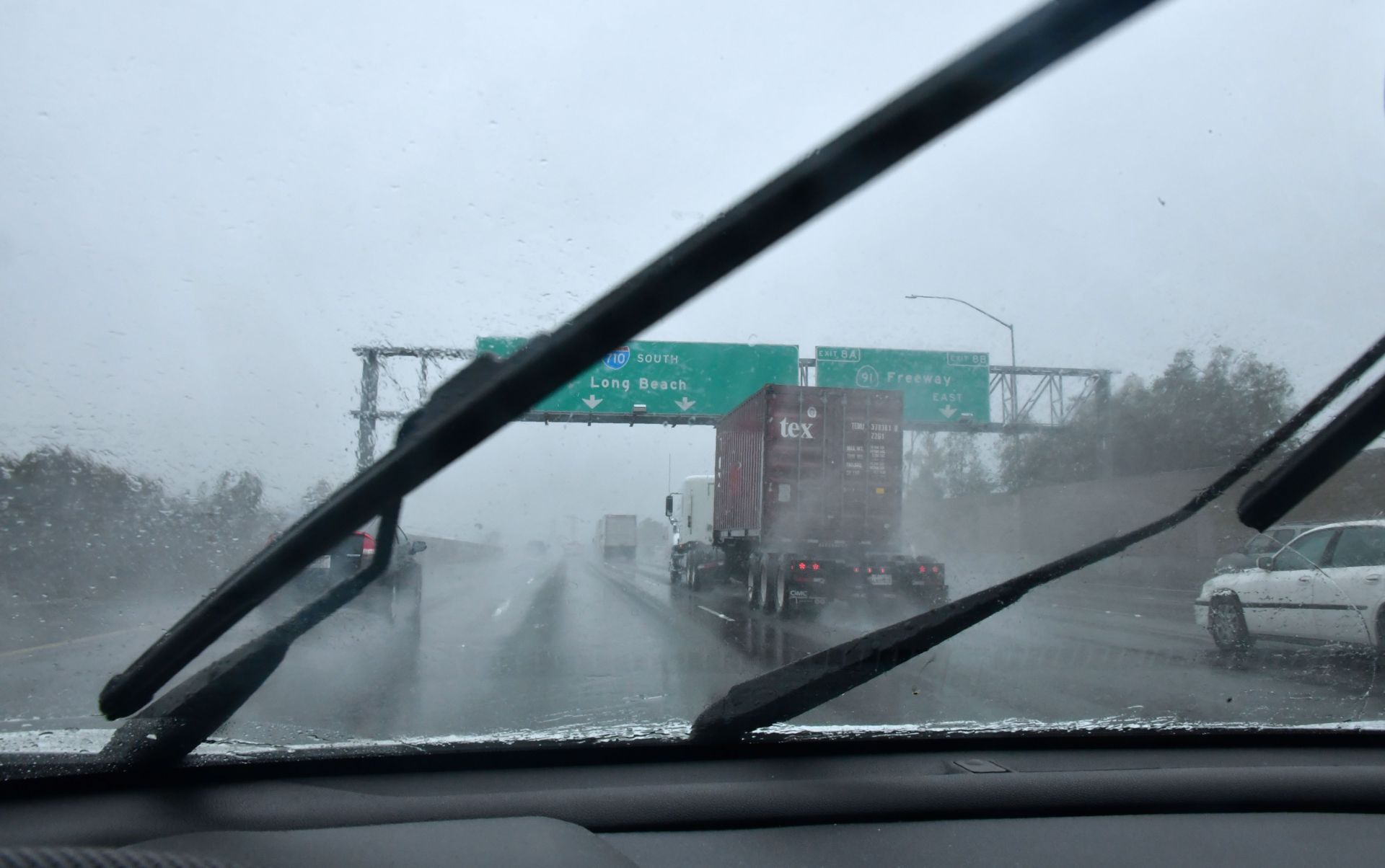 Mưa trên xa lộ 710 đoạn đi ngang thành phố Long Beach. (Hình minh hoạ: FREDERIC J. BROWN/AFP via Getty Images)