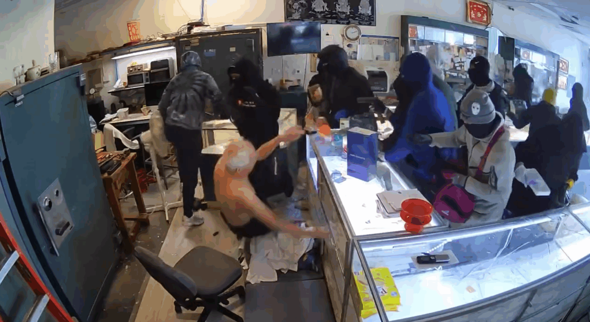 Camera cho thấy một chiếc xe SUV lủi đuôi xe tông sập cửa kiếng tiệm và nhóm cướp từ ít nhất ba chiếc sedan khác ào ra xông vào tiệm vàng, cầm theo hung khí bắt đầu đập phá các tủ kiếng bên trong, và cướp đi một số nữ trang.